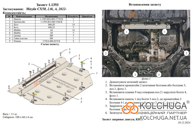 Ochrana motorového priestoru pre Mazda CX-50 rok od 2022 sa vyrába pomocou moderných technológií z materiálov najvyššej kvality. Ako základ používame za studena valcovanú oceľ s hrúbkou 2 mm. Pomocou lisovania dávame ochrane jedinečný tvar pre každý automobil tak, aby sa montovala na originálne montážne body bez potreby dodatočného vŕtania alebo zvárania. Vďaka tomu je proces inštalácie maximálne jednoduchý. Všetky potrebné montážne prvky sú súčasťou balenia.