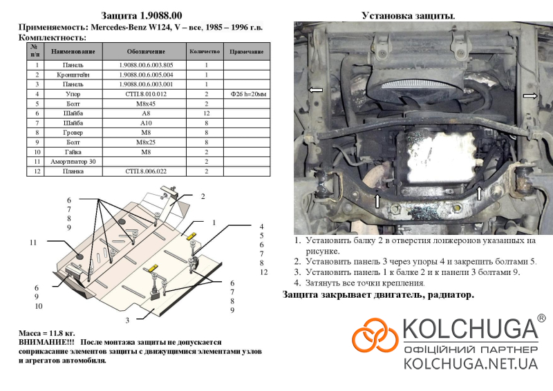 Ochrana motorového priestoru pre Mercedes-Benz E-class W124 rok 1984-1996 sa vyrába pomocou moderných technológií z materiálov najvyššej kvality. Ako základ používame za studena valcovanú oceľ s hrúbkou 2 mm. Pomocou lisovania dávame ochrane jedinečný tvar pre každý automobil tak, aby sa montovala na originálne montážne body bez potreby dodatočného vŕtania alebo zvárania. Vďaka tomu je proces inštalácie maximálne jednoduchý. Všetky potrebné montážne prvky sú súčasťou balenia.