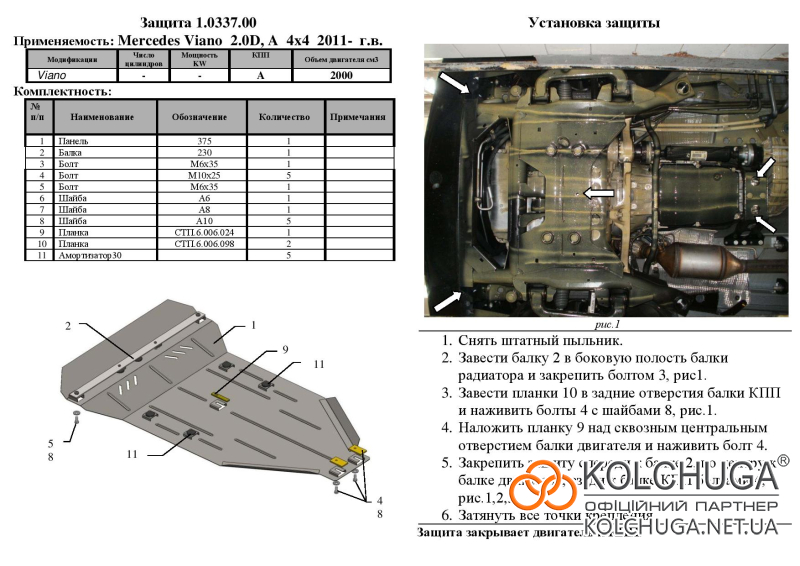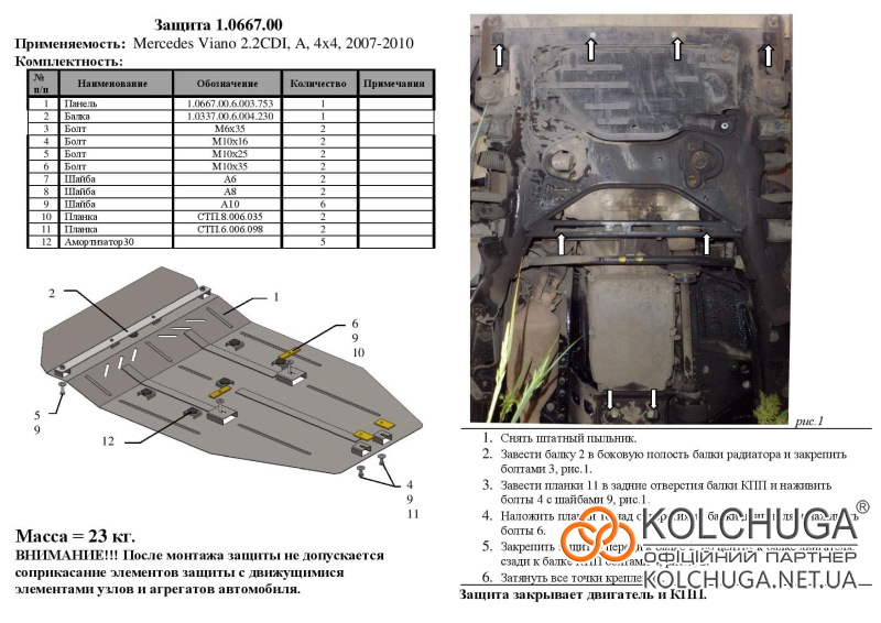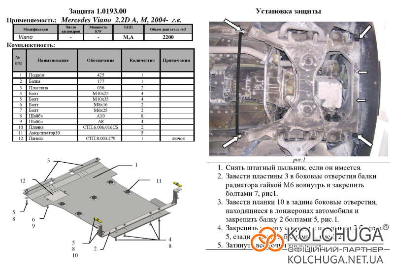 Ochrana motorového priestoru pre Mercedes-Benz Viano W639 rok 2004-2014 sa vyrába pomocou moderných technológií z materiálov najvyššej kvality. Ako základ používame za studena valcovanú oceľ s hrúbkou 2 mm. Pomocou lisovania dávame ochrane jedinečný tvar pre každý automobil tak, aby sa montovala na originálne montážne body bez potreby dodatočného vŕtania alebo zvárania. Vďaka tomu je proces inštalácie maximálne jednoduchý. Všetky potrebné montážne prvky sú súčasťou balenia.