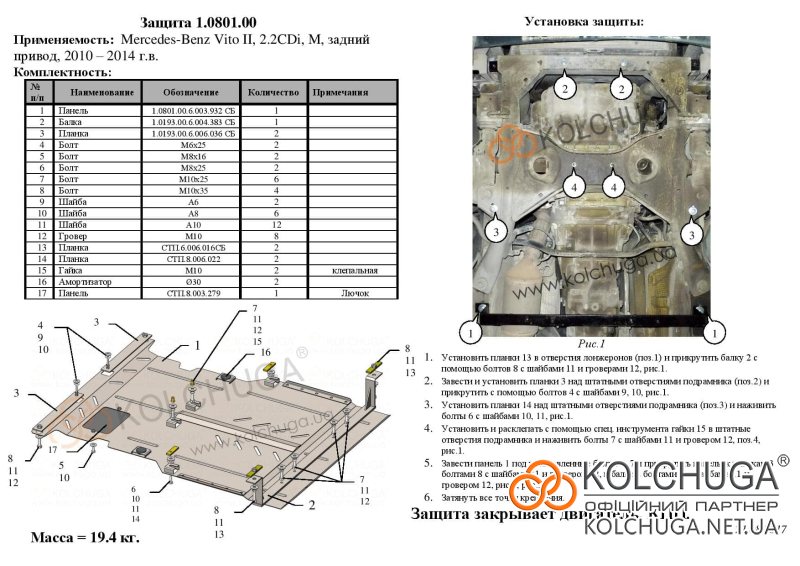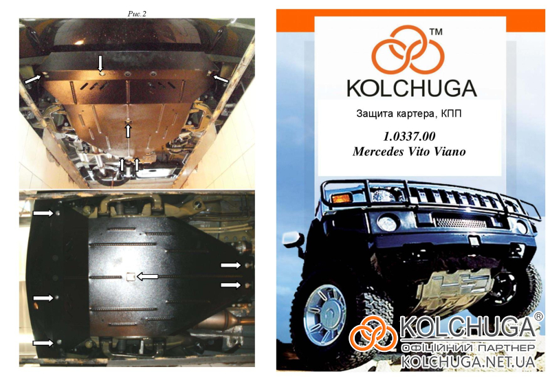Ochrana motorového priestoru pre Mercedes-Benz Vito W639 rok 2004-2014 sa vyrába pomocou moderných technológií z materiálov najvyššej kvality. Ako základ používame za studena valcovanú oceľ s hrúbkou 2 mm. Pomocou lisovania dávame ochrane jedinečný tvar pre každý automobil tak, aby sa montovala na originálne montážne body bez potreby dodatočného vŕtania alebo zvárania. Vďaka tomu je proces inštalácie maximálne jednoduchý. Všetky potrebné montážne prvky sú súčasťou balenia.