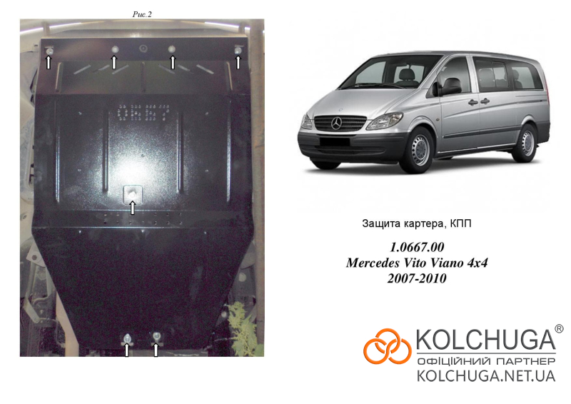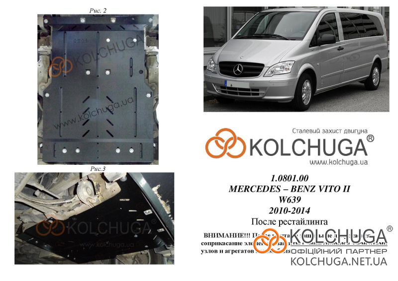 Ochrana motora Mercedes-Benz Vito W639 rok 2004-2014 nielenže chráni olejovú vaňu pred fyzickým nárazom, ale zároveň celý motorový priestor pred vniknutím vody, prachu a nečistôt. To výrazne predlžuje životnosť remeňov, kladiek a ďalších pohyblivých častí v motorovom priestore. Ochrany sa inštalujú namiesto plastových a ich plynulé tvary kopírujú tvar podvozku vozidla, čím zlepšujú aerodynamiku.