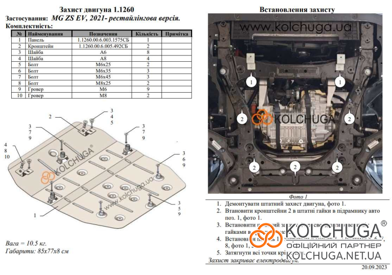 Ochrana motorového priestoru pre MG ZS 1 EV facelift rok od 2022 sa vyrába pomocou moderných technológií z materiálov najvyššej kvality. Ako základ používame za studena valcovanú oceľ s hrúbkou 2 mm. Pomocou lisovania dávame ochrane jedinečný tvar pre každý automobil tak, aby sa montovala na originálne montážne body bez potreby dodatočného vŕtania alebo zvárania. Vďaka tomu je proces inštalácie maximálne jednoduchý. Všetky potrebné montážne prvky sú súčasťou balenia.