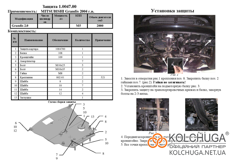 Ochrana motorového priestoru pre Mitsubishi Grandis rok 2003-2011 sa vyrába pomocou moderných technológií z materiálov najvyššej kvality. Ako základ používame za studena valcovanú oceľ s hrúbkou 2 mm. Pomocou lisovania dávame ochrane jedinečný tvar pre každý automobil tak, aby sa montovala na originálne montážne body bez potreby dodatočného vŕtania alebo zvárania. Vďaka tomu je proces inštalácie maximálne jednoduchý. Všetky potrebné montážne prvky sú súčasťou balenia.
