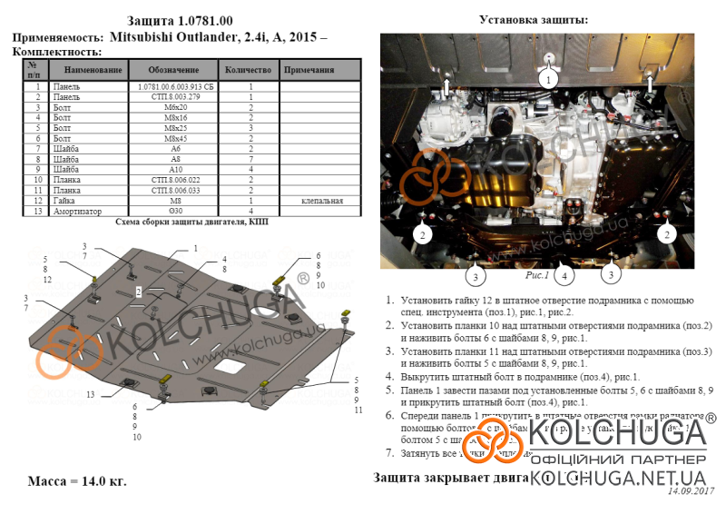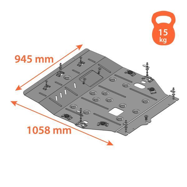 Ochrana motorového priestoru pre Mitsubishi Outlander 3 facelift rok 2015-2021 sa vyrába pomocou moderných technológií z materiálov najvyššej kvality. Ako základ používame za studena valcovanú oceľ s hrúbkou 2 mm. Pomocou lisovania dávame ochrane jedinečný tvar pre každý automobil tak, aby sa montovala na originálne montážne body bez potreby dodatočného vŕtania alebo zvárania. Vďaka tomu je proces inštalácie maximálne jednoduchý. Všetky potrebné montážne prvky sú súčasťou balenia.