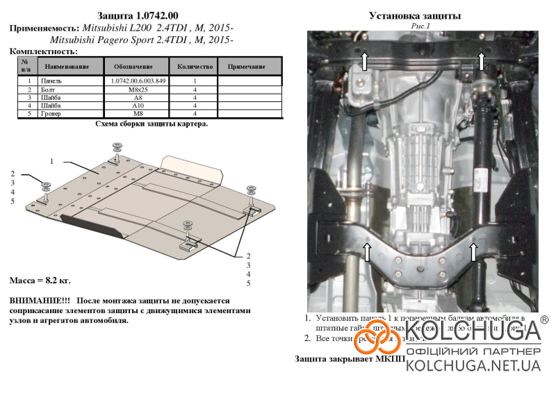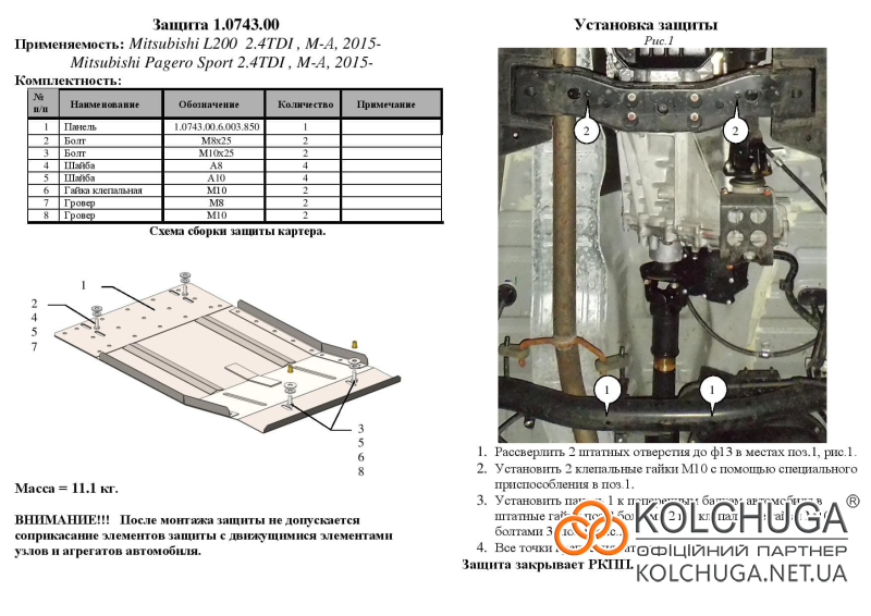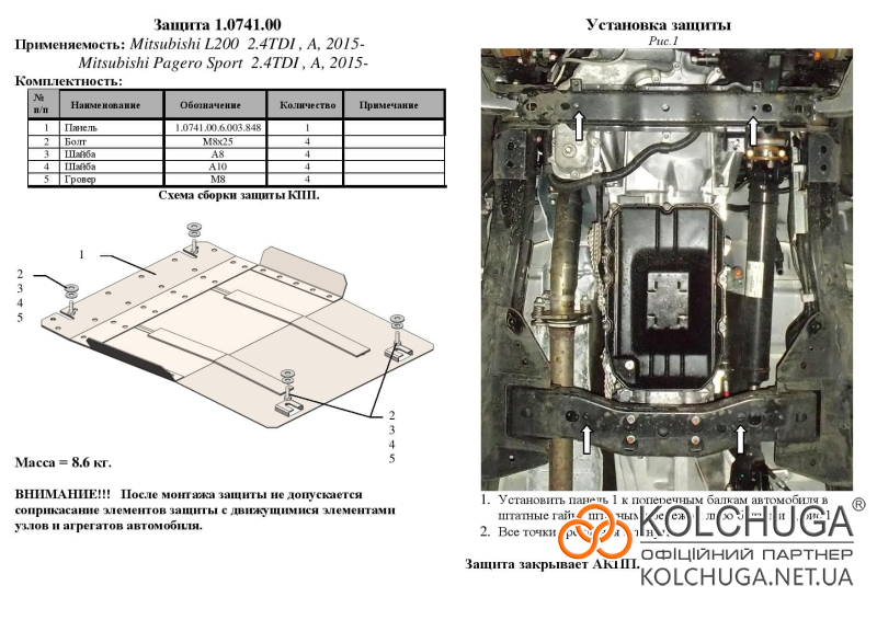 Ochrana motorového priestoru pre Mitsubishi Pajero Sport 3 rok -2015 sa vyrába pomocou moderných technológií z materiálov najvyššej kvality. Ako základ používame za studena valcovanú oceľ s hrúbkou 2 mm. Pomocou lisovania dávame ochrane jedinečný tvar pre každý automobil tak, aby sa montovala na originálne montážne body bez potreby dodatočného vŕtania alebo zvárania. Vďaka tomu je proces inštalácie maximálne jednoduchý. Všetky potrebné montážne prvky sú súčasťou balenia.