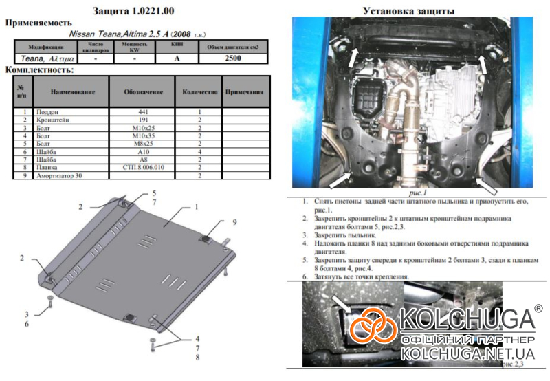 Ochrana motorového priestoru pre Nissan Altima 4 rok 2007-2013 sa vyrába pomocou moderných technológií z materiálov najvyššej kvality. Ako základ používame za studena valcovanú oceľ s hrúbkou 2 mm. Pomocou lisovania dávame ochrane jedinečný tvar pre každý automobil tak, aby sa montovala na originálne montážne body bez potreby dodatočného vŕtania alebo zvárania. Vďaka tomu je proces inštalácie maximálne jednoduchý. Všetky potrebné montážne prvky sú súčasťou balenia.