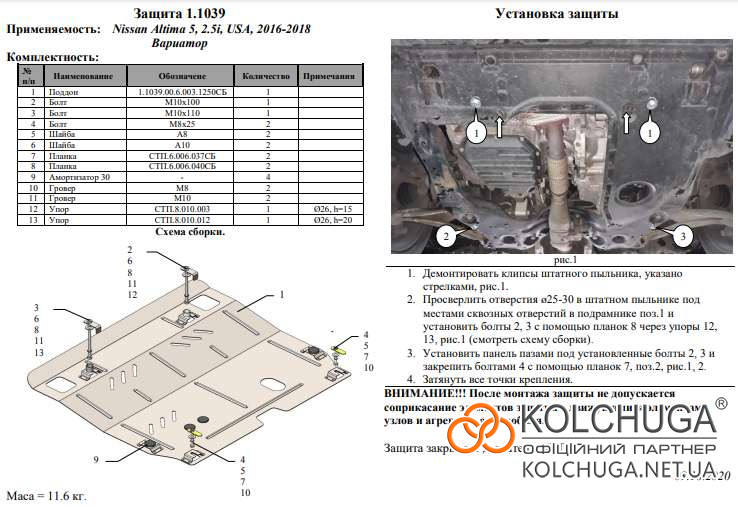 Ochrana motorového priestoru pre Nissan Altima 5 рестайлінг rok 2016-2018 sa vyrába pomocou moderných technológií z materiálov najvyššej kvality. Ako základ používame za studena valcovanú oceľ s hrúbkou 2 mm. Pomocou lisovania dávame ochrane jedinečný tvar pre každý automobil tak, aby sa montovala na originálne montážne body bez potreby dodatočného vŕtania alebo zvárania. Vďaka tomu je proces inštalácie maximálne jednoduchý. Všetky potrebné montážne prvky sú súčasťou balenia.