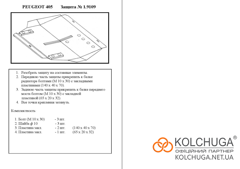 Ochrana motorového priestoru pre Peugeot 405 rok 1987-1997 sa vyrába pomocou moderných technológií z materiálov najvyššej kvality. Ako základ používame za studena valcovanú oceľ s hrúbkou 2 mm. Pomocou lisovania dávame ochrane jedinečný tvar pre každý automobil tak, aby sa montovala na originálne montážne body bez potreby dodatočného vŕtania alebo zvárania. Vďaka tomu je proces inštalácie maximálne jednoduchý. Všetky potrebné montážne prvky sú súčasťou balenia.