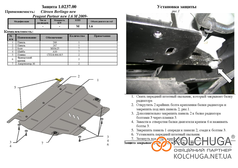 Ochrana motorového priestoru pre Peugeot Partner II B9 rok od 2008 sa vyrába pomocou moderných technológií z materiálov najvyššej kvality. Ako základ používame za studena valcovanú oceľ s hrúbkou 2 mm. Pomocou lisovania dávame ochrane jedinečný tvar pre každý automobil tak, aby sa montovala na originálne montážne body bez potreby dodatočného vŕtania alebo zvárania. Vďaka tomu je proces inštalácie maximálne jednoduchý. Všetky potrebné montážne prvky sú súčasťou balenia.