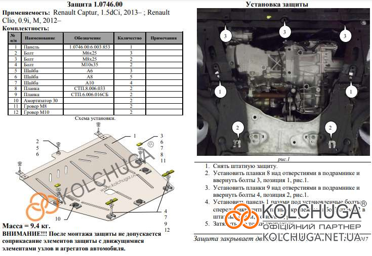 Ochrana motorového priestoru pre Renault Clio 3 facelift rok 2009-2012 sa vyrába pomocou moderných technológií z materiálov najvyššej kvality. Ako základ používame za studena valcovanú oceľ s hrúbkou 2 mm. Pomocou lisovania dávame ochrane jedinečný tvar pre každý automobil tak, aby sa montovala na originálne montážne body bez potreby dodatočného vŕtania alebo zvárania. Vďaka tomu je proces inštalácie maximálne jednoduchý. Všetky potrebné montážne prvky sú súčasťou balenia.
