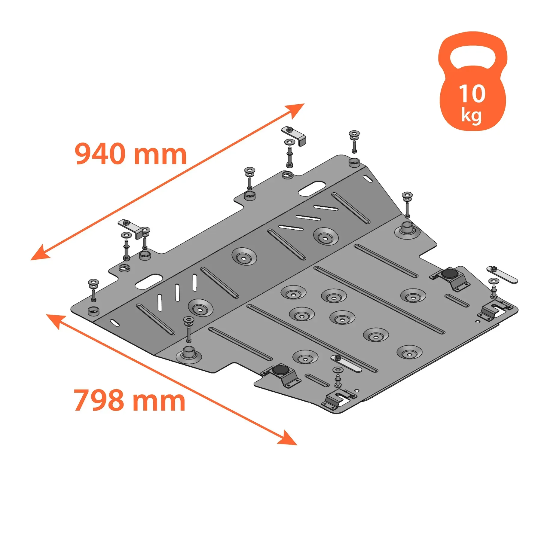 Ochrana motorového priestoru pre Renault Kangoo 2 rok 2008-2021 sa vyrába pomocou moderných technológií z materiálov najvyššej kvality. Ako základ používame za studena valcovanú oceľ s hrúbkou 2 mm. Pomocou lisovania dávame ochrane jedinečný tvar pre každý automobil tak, aby sa montovala na originálne montážne body bez potreby dodatočného vŕtania alebo zvárania. Vďaka tomu je proces inštalácie maximálne jednoduchý. Všetky potrebné montážne prvky sú súčasťou balenia.