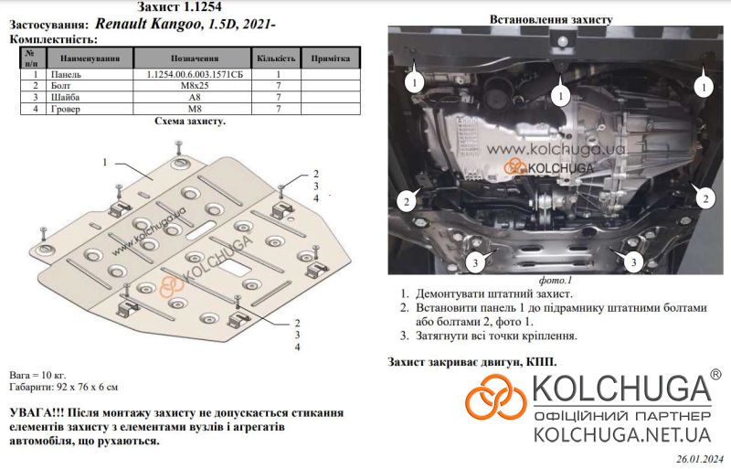 Ochrana motorového priestoru pre Renault Kangoo 3 rok od 2021 sa vyrába pomocou moderných technológií z materiálov najvyššej kvality. Ako základ používame za studena valcovanú oceľ s hrúbkou 2 mm. Pomocou lisovania dávame ochrane jedinečný tvar pre každý automobil tak, aby sa montovala na originálne montážne body bez potreby dodatočného vŕtania alebo zvárania. Vďaka tomu je proces inštalácie maximálne jednoduchý. Všetky potrebné montážne prvky sú súčasťou balenia.