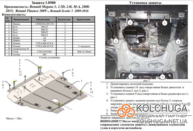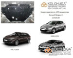 Ochrana motorového priestoru pre Renault Megane 3 rok 2008-2016 sa vyrába pomocou moderných technológií z materiálov najvyššej kvality. Ako základ používame za studena valcovanú oceľ s hrúbkou 2 mm. Pomocou lisovania dávame ochrane jedinečný tvar pre každý automobil tak, aby sa montovala na originálne montážne body bez potreby dodatočného vŕtania alebo zvárania. Vďaka tomu je proces inštalácie maximálne jednoduchý. Všetky potrebné montážne prvky sú súčasťou balenia.