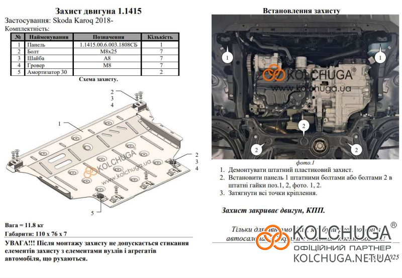 Ochrana motorového priestoru pre Skoda Karoq rok -2018 sa vyrába pomocou moderných technológií z materiálov najvyššej kvality. Ako základ používame za studena valcovanú oceľ s hrúbkou 2 mm. Pomocou lisovania dávame ochrane jedinečný tvar pre každý automobil tak, aby sa montovala na originálne montážne body bez potreby dodatočného vŕtania alebo zvárania. Vďaka tomu je proces inštalácie maximálne jednoduchý. Všetky potrebné montážne prvky sú súčasťou balenia.
