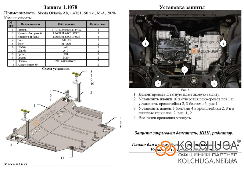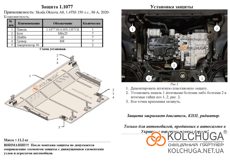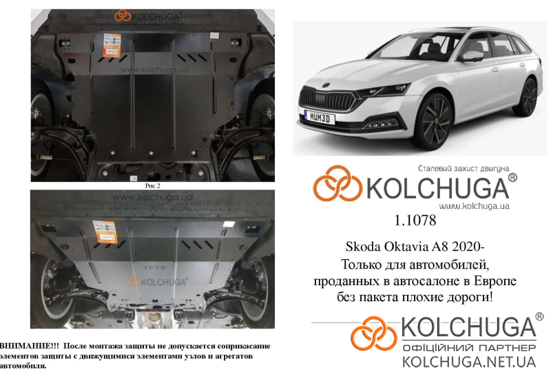 Ochrana motorového priestoru pre Skoda Octavia A8 rok od 2020 sa vyrába pomocou moderných technológií z materiálov najvyššej kvality. Ako základ používame za studena valcovanú oceľ s hrúbkou 2 mm. Pomocou lisovania dávame ochrane jedinečný tvar pre každý automobil tak, aby sa montovala na originálne montážne body bez potreby dodatočného vŕtania alebo zvárania. Vďaka tomu je proces inštalácie maximálne jednoduchý. Všetky potrebné montážne prvky sú súčasťou balenia.