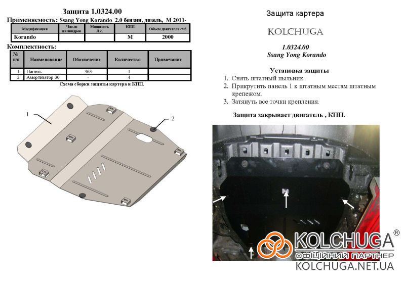 Ochrana motorového priestoru pre Ssang Yong Korando 3 rok od 2010 sa vyrába pomocou moderných technológií z materiálov najvyššej kvality. Ako základ používame za studena valcovanú oceľ s hrúbkou 2 mm. Pomocou lisovania dávame ochrane jedinečný tvar pre každý automobil tak, aby sa montovala na originálne montážne body bez potreby dodatočného vŕtania alebo zvárania. Vďaka tomu je proces inštalácie maximálne jednoduchý. Všetky potrebné montážne prvky sú súčasťou balenia.