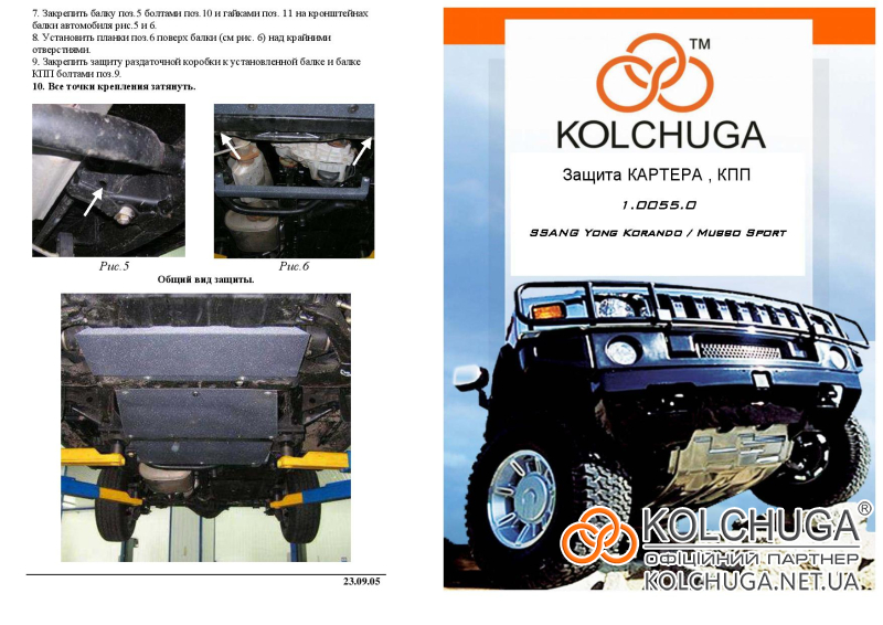 Ochrana motorového priestoru pre Ssang Yong Musso Sports rok 2002-2005 sa vyrába pomocou moderných technológií z materiálov najvyššej kvality. Ako základ používame za studena valcovanú oceľ s hrúbkou 2 mm. Pomocou lisovania dávame ochrane jedinečný tvar pre každý automobil tak, aby sa montovala na originálne montážne body bez potreby dodatočného vŕtania alebo zvárania. Vďaka tomu je proces inštalácie maximálne jednoduchý. Všetky potrebné montážne prvky sú súčasťou balenia.