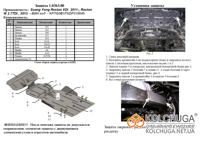 Ochrana motorového priestoru pre Ssang Yong Rexton 1 W rok 2012-2017 sa vyrába pomocou moderných technológií z materiálov najvyššej kvality. Ako základ používame za studena valcovanú oceľ s hrúbkou 2 mm. Pomocou lisovania dávame ochrane jedinečný tvar pre každý automobil tak, aby sa montovala na originálne montážne body bez potreby dodatočného vŕtania alebo zvárania. Vďaka tomu je proces inštalácie maximálne jednoduchý. Všetky potrebné montážne prvky sú súčasťou balenia.