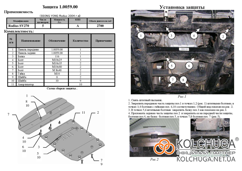 Ochrana motorového priestoru pre Ssang Yong Rodius rok 2004-2013 sa vyrába pomocou moderných technológií z materiálov najvyššej kvality. Ako základ používame za studena valcovanú oceľ s hrúbkou 2 mm. Pomocou lisovania dávame ochrane jedinečný tvar pre každý automobil tak, aby sa montovala na originálne montážne body bez potreby dodatočného vŕtania alebo zvárania. Vďaka tomu je proces inštalácie maximálne jednoduchý. Všetky potrebné montážne prvky sú súčasťou balenia.