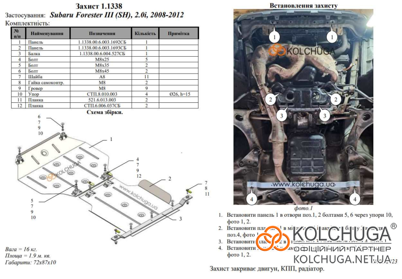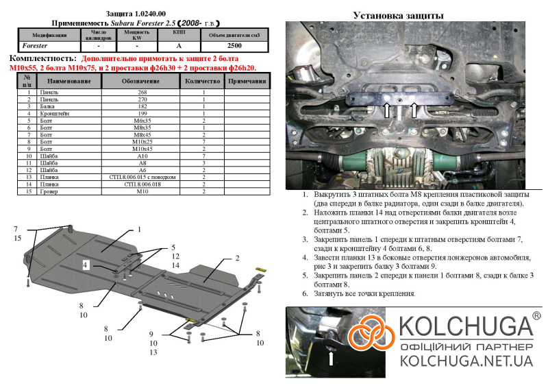 Ochrana motorového priestoru pre Subaru Forester 3 SH rok 2008-2012 sa vyrába pomocou moderných technológií z materiálov najvyššej kvality. Ako základ používame za studena valcovanú oceľ s hrúbkou 2 mm. Pomocou lisovania dávame ochrane jedinečný tvar pre každý automobil tak, aby sa montovala na originálne montážne body bez potreby dodatočného vŕtania alebo zvárania. Vďaka tomu je proces inštalácie maximálne jednoduchý. Všetky potrebné montážne prvky sú súčasťou balenia.