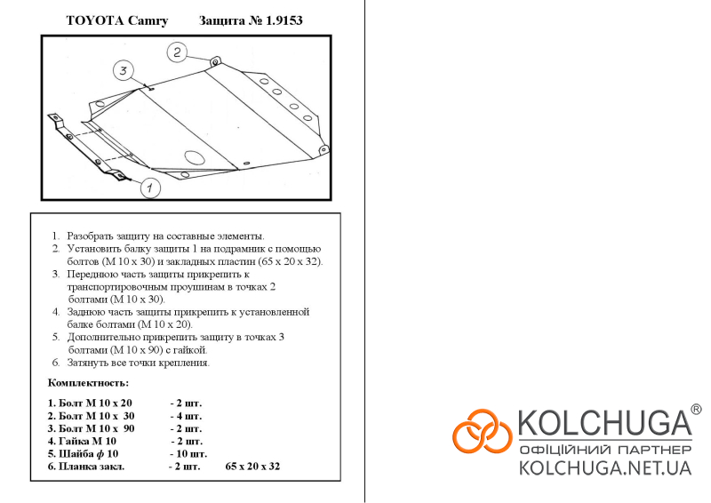 Ochrana motorového priestoru pre Toyota Camry 20 rok 1997-2001 sa vyrába pomocou moderných technológií z materiálov najvyššej kvality. Ako základ používame za studena valcovanú oceľ s hrúbkou 2 mm. Pomocou lisovania dávame ochrane jedinečný tvar pre každý automobil tak, aby sa montovala na originálne montážne body bez potreby dodatočného vŕtania alebo zvárania. Vďaka tomu je proces inštalácie maximálne jednoduchý. Všetky potrebné montážne prvky sú súčasťou balenia.