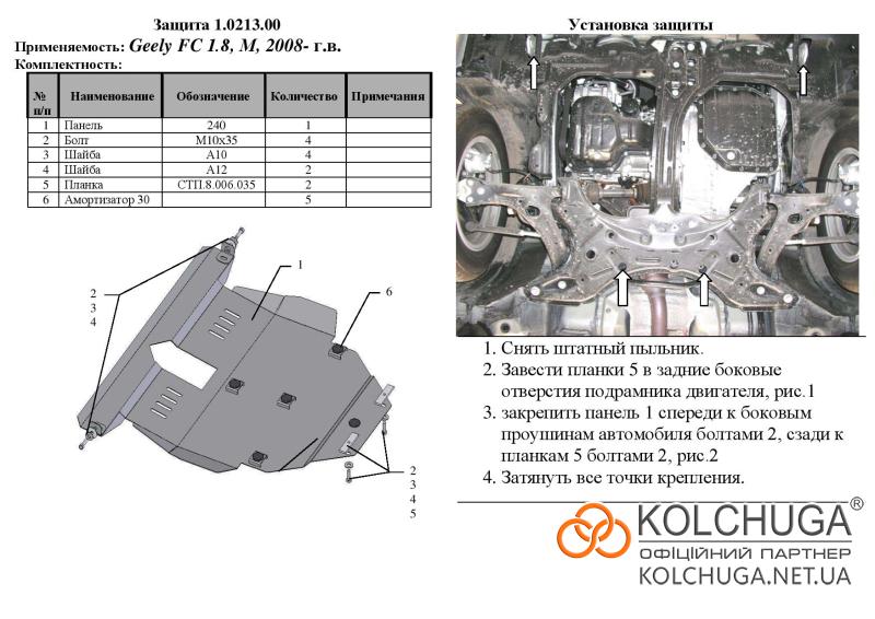 Kolchuga patrí medzi najspoľahlivejšie oceľové kryty podvozku na trhu. Vyrábané z vysokopevnostnej ocele, presne tvarované pre každý model auta a navrhnuté tak, aby chránili motor, prevodovku a ďalšie dôležité časti pri jazde v meste aj v teréne. Robustné, odolné a pripravené pre dlhé roky používania.