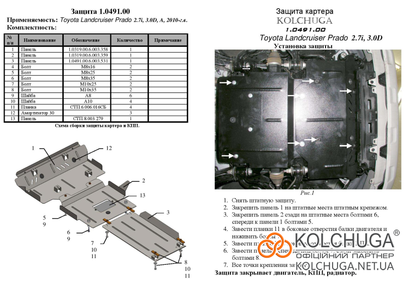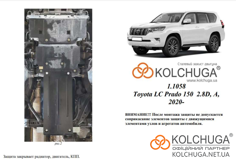 Ochrana motora Toyota Land Cruiser Prado 150 rok 2009-2023 nielenže chráni olejovú vaňu pred fyzickým nárazom, ale zároveň celý motorový priestor pred vniknutím vody, prachu a nečistôt. To výrazne predlžuje životnosť remeňov, kladiek a ďalších pohyblivých častí v motorovom priestore. Ochrany sa inštalujú namiesto plastových a ich plynulé tvary kopírujú tvar podvozku vozidla, čím zlepšujú aerodynamiku.