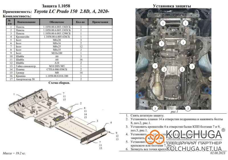 Ochrana motorového priestoru pre Toyota Land Cruiser Prado 150 rok 2009-2023 sa vyrába pomocou moderných technológií z materiálov najvyššej kvality. Ako základ používame za studena valcovanú oceľ s hrúbkou 2 mm. Pomocou lisovania dávame ochrane jedinečný tvar pre každý automobil tak, aby sa montovala na originálne montážne body bez potreby dodatočného vŕtania alebo zvárania. Vďaka tomu je proces inštalácie maximálne jednoduchý. Všetky potrebné montážne prvky sú súčasťou balenia.