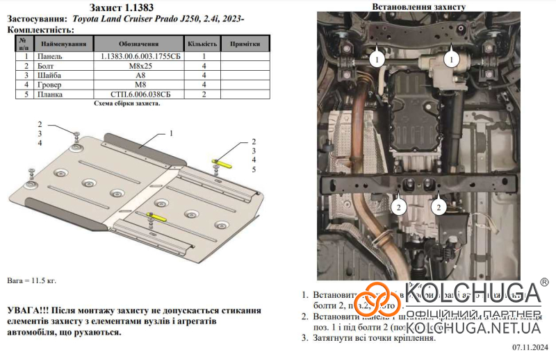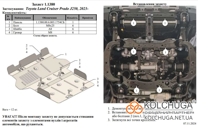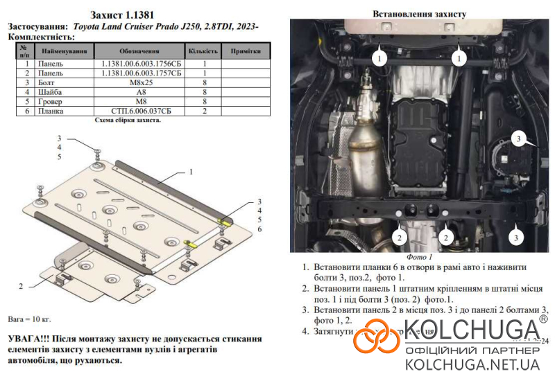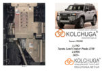 Ochrana motorového priestoru pre Toyota Land Cruiser Prado 250 rok od 2023 sa vyrába pomocou moderných technológií z materiálov najvyššej kvality. Ako základ používame za studena valcovanú oceľ s hrúbkou 2 mm. Pomocou lisovania dávame ochrane jedinečný tvar pre každý automobil tak, aby sa montovala na originálne montážne body bez potreby dodatočného vŕtania alebo zvárania. Vďaka tomu je proces inštalácie maximálne jednoduchý. Všetky potrebné montážne prvky sú súčasťou balenia.