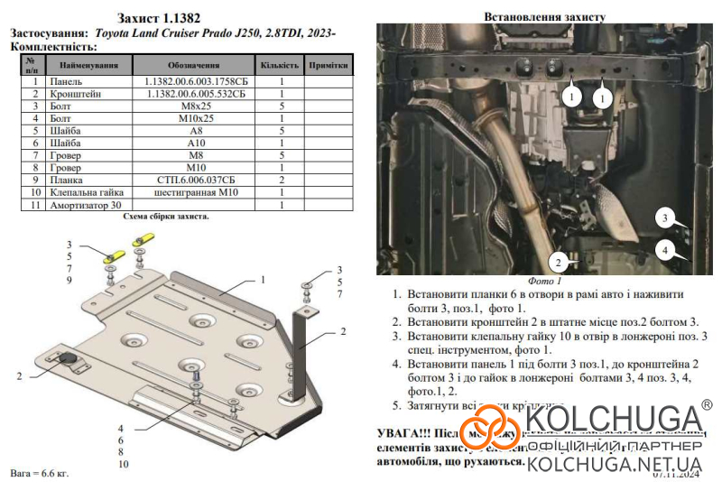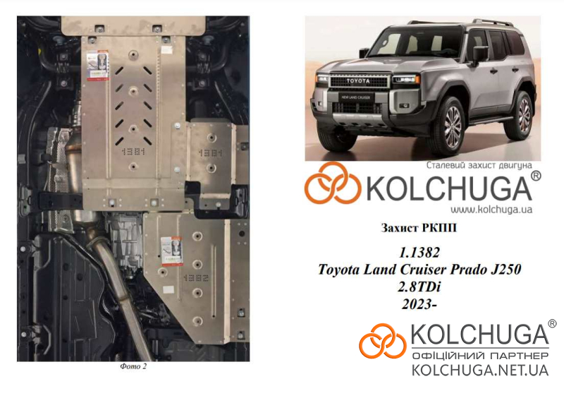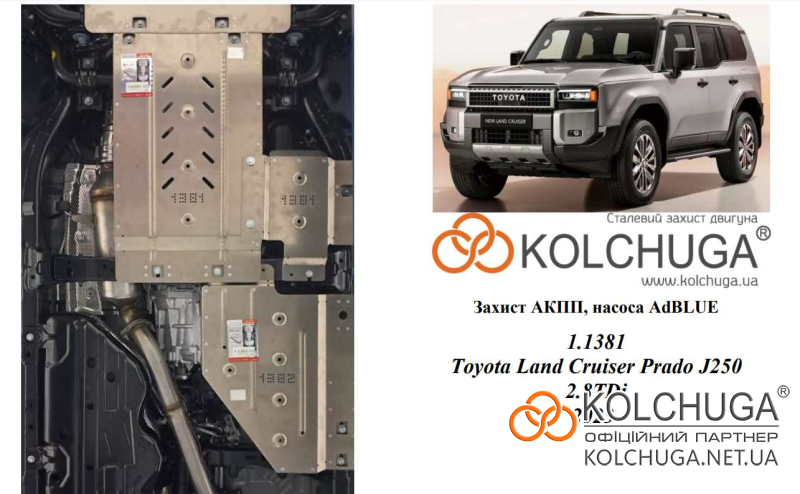 Ochrana motora Toyota Land Cruiser Prado 250 rok od 2023 nielenže chráni olejovú vaňu pred fyzickým nárazom, ale zároveň celý motorový priestor pred vniknutím vody, prachu a nečistôt. To výrazne predlžuje životnosť remeňov, kladiek a ďalších pohyblivých častí v motorovom priestore. Ochrany sa inštalujú namiesto plastových a ich plynulé tvary kopírujú tvar podvozku vozidla, čím zlepšujú aerodynamiku.