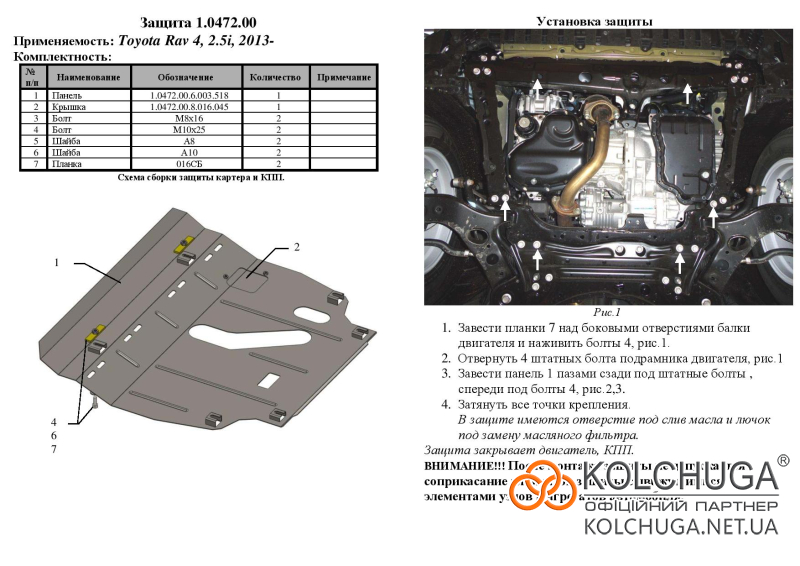 Ochrana motorového priestoru pre Toyota RAV4 4 rok 2013-2018 sa vyrába pomocou moderných technológií z materiálov najvyššej kvality. Ako základ používame za studena valcovanú oceľ s hrúbkou 2 mm. Pomocou lisovania dávame ochrane jedinečný tvar pre každý automobil tak, aby sa montovala na originálne montážne body bez potreby dodatočného vŕtania alebo zvárania. Vďaka tomu je proces inštalácie maximálne jednoduchý. Všetky potrebné montážne prvky sú súčasťou balenia.