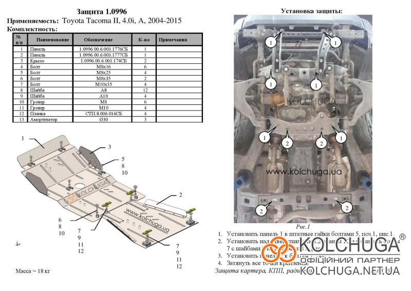 Ochrana motorového priestoru pre Toyota Tacoma 2 rok 2004-2015 sa vyrába pomocou moderných technológií z materiálov najvyššej kvality. Ako základ používame za studena valcovanú oceľ s hrúbkou 2 mm. Pomocou lisovania dávame ochrane jedinečný tvar pre každý automobil tak, aby sa montovala na originálne montážne body bez potreby dodatočného vŕtania alebo zvárania. Vďaka tomu je proces inštalácie maximálne jednoduchý. Všetky potrebné montážne prvky sú súčasťou balenia.
