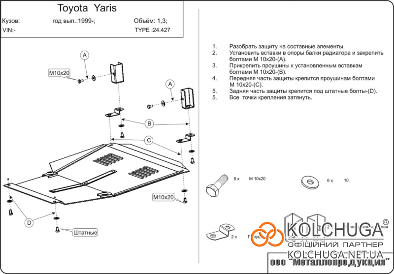 Ochrana motorového priestoru pre Toyota Yaris 1 rok 1999-2005 sa vyrába pomocou moderných technológií z materiálov najvyššej kvality. Ako základ používame za studena valcovanú oceľ s hrúbkou 2 mm. Pomocou lisovania dávame ochrane jedinečný tvar pre každý automobil tak, aby sa montovala na originálne montážne body bez potreby dodatočného vŕtania alebo zvárania. Vďaka tomu je proces inštalácie maximálne jednoduchý. Všetky potrebné montážne prvky sú súčasťou balenia.