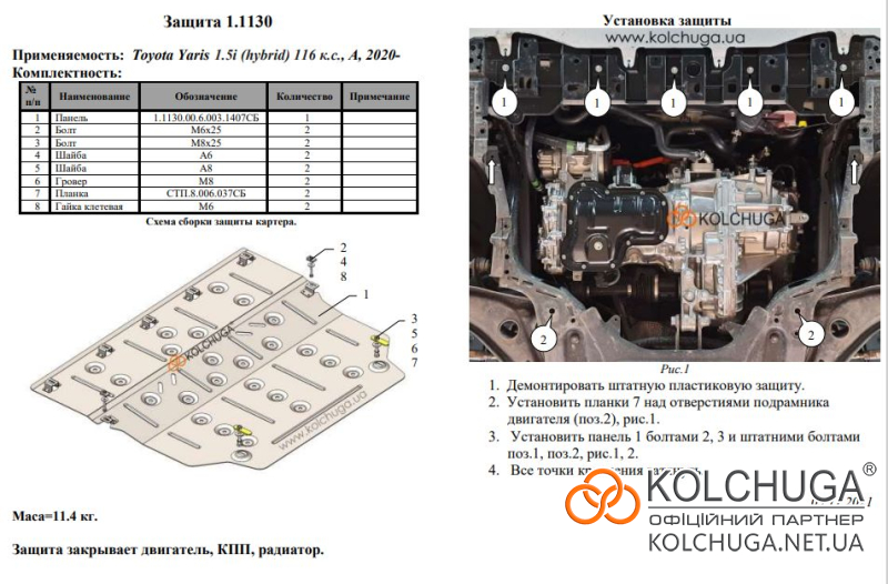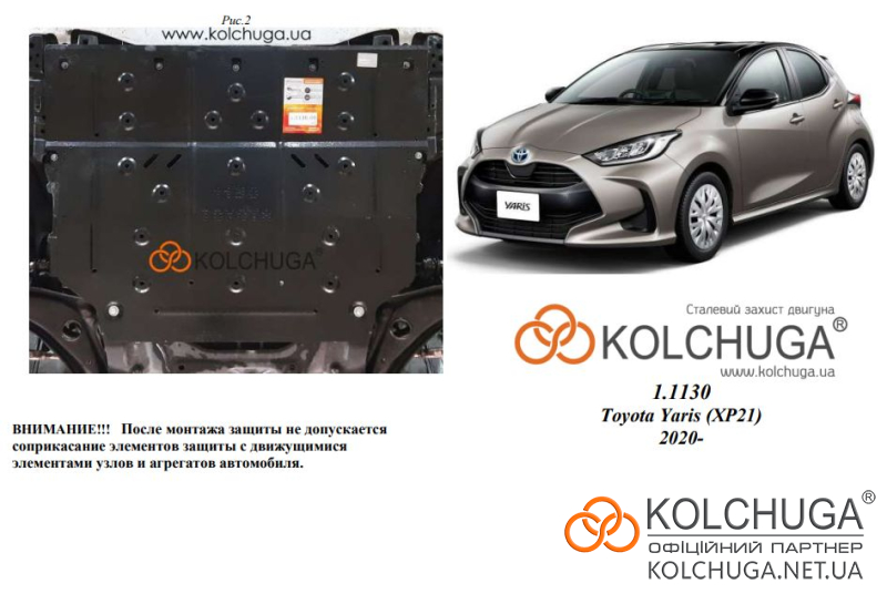 Ochrana motorového priestoru pre Toyota Yaris 4 rok od 2020 sa vyrába pomocou moderných technológií z materiálov najvyššej kvality. Ako základ používame za studena valcovanú oceľ s hrúbkou 2 mm. Pomocou lisovania dávame ochrane jedinečný tvar pre každý automobil tak, aby sa montovala na originálne montážne body bez potreby dodatočného vŕtania alebo zvárania. Vďaka tomu je proces inštalácie maximálne jednoduchý. Všetky potrebné montážne prvky sú súčasťou balenia.