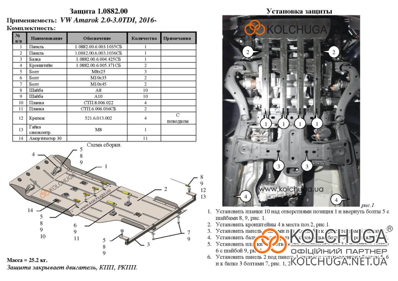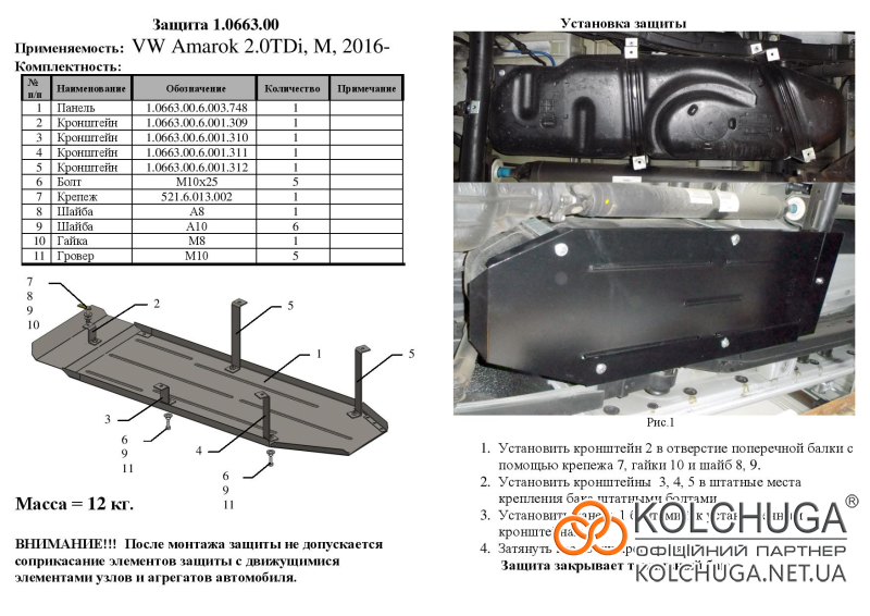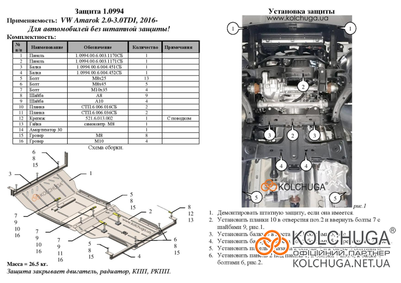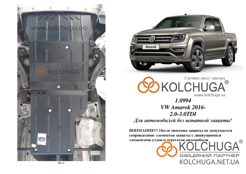 Ochrana motorového priestoru pre Volkswagen Amarok 1 рестайлинг rok 2016-2020 sa vyrába pomocou moderných technológií z materiálov najvyššej kvality. Ako základ používame za studena valcovanú oceľ s hrúbkou 2 mm. Pomocou lisovania dávame ochrane jedinečný tvar pre každý automobil tak, aby sa montovala na originálne montážne body bez potreby dodatočného vŕtania alebo zvárania. Vďaka tomu je proces inštalácie maximálne jednoduchý. Všetky potrebné montážne prvky sú súčasťou balenia.