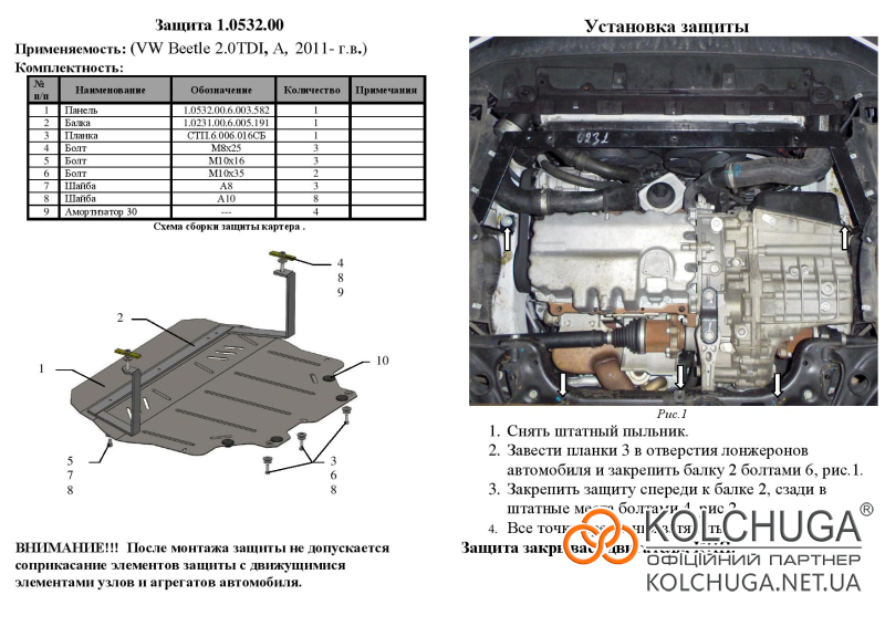 Ochrana motorového priestoru pre Volkswagen Beetle rok od 2011 sa vyrába pomocou moderných technológií z materiálov najvyššej kvality. Ako základ používame za studena valcovanú oceľ s hrúbkou 2 mm. Pomocou lisovania dávame ochrane jedinečný tvar pre každý automobil tak, aby sa montovala na originálne montážne body bez potreby dodatočného vŕtania alebo zvárania. Vďaka tomu je proces inštalácie maximálne jednoduchý. Všetky potrebné montážne prvky sú súčasťou balenia.