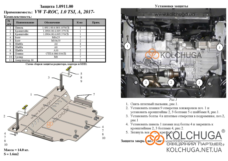 Ochrana motorového priestoru pre Volkswagen T-ROC rok od 2017 sa vyrába pomocou moderných technológií z materiálov najvyššej kvality. Ako základ používame za studena valcovanú oceľ s hrúbkou 2 mm. Pomocou lisovania dávame ochrane jedinečný tvar pre každý automobil tak, aby sa montovala na originálne montážne body bez potreby dodatočného vŕtania alebo zvárania. Vďaka tomu je proces inštalácie maximálne jednoduchý. Všetky potrebné montážne prvky sú súčasťou balenia.