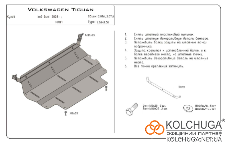 Ochrana motorového priestoru pre Volkswagen Tiguan 1 rok 2007-2016 sa vyrába pomocou moderných technológií z materiálov najvyššej kvality. Ako základ používame za studena valcovanú oceľ s hrúbkou 2 mm. Pomocou lisovania dávame ochrane jedinečný tvar pre každý automobil tak, aby sa montovala na originálne montážne body bez potreby dodatočného vŕtania alebo zvárania. Vďaka tomu je proces inštalácie maximálne jednoduchý. Všetky potrebné montážne prvky sú súčasťou balenia.
