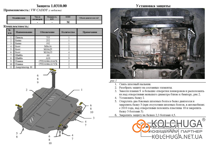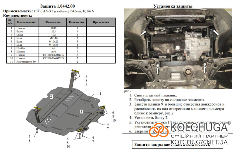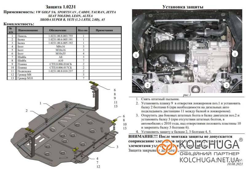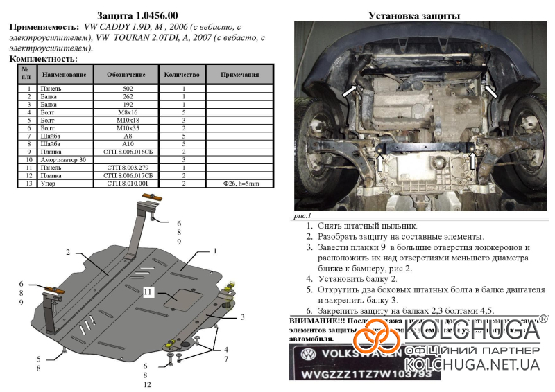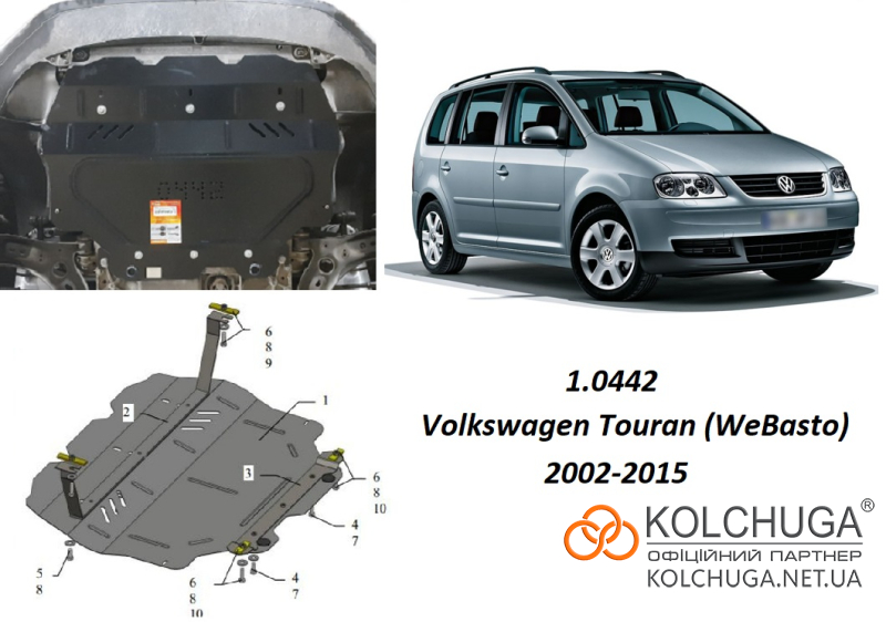 Ochrana motorového priestoru pre Volkswagen Touran 1 rok 2003-2015 sa vyrába pomocou moderných technológií z materiálov najvyššej kvality. Ako základ používame za studena valcovanú oceľ s hrúbkou 2 mm. Pomocou lisovania dávame ochrane jedinečný tvar pre každý automobil tak, aby sa montovala na originálne montážne body bez potreby dodatočného vŕtania alebo zvárania. Vďaka tomu je proces inštalácie maximálne jednoduchý. Všetky potrebné montážne prvky sú súčasťou balenia.