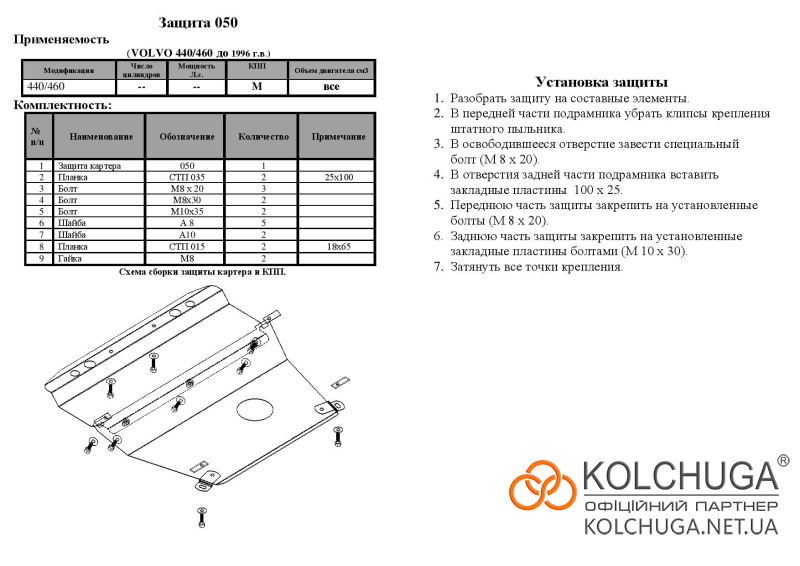Ochrana motorového priestoru pre Volvo 440/460 rok 1988-1996 sa vyrába pomocou moderných technológií z materiálov najvyššej kvality. Ako základ používame za studena valcovanú oceľ s hrúbkou 2 mm. Pomocou lisovania dávame ochrane jedinečný tvar pre každý automobil tak, aby sa montovala na originálne montážne body bez potreby dodatočného vŕtania alebo zvárania. Vďaka tomu je proces inštalácie maximálne jednoduchý. Všetky potrebné montážne prvky sú súčasťou balenia.