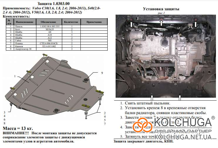 Ochrana motorového priestoru pre Volvo V50 rok 2004-2012 sa vyrába pomocou moderných technológií z materiálov najvyššej kvality. Ako základ používame za studena valcovanú oceľ s hrúbkou 2 mm. Pomocou lisovania dávame ochrane jedinečný tvar pre každý automobil tak, aby sa montovala na originálne montážne body bez potreby dodatočného vŕtania alebo zvárania. Vďaka tomu je proces inštalácie maximálne jednoduchý. Všetky potrebné montážne prvky sú súčasťou balenia.